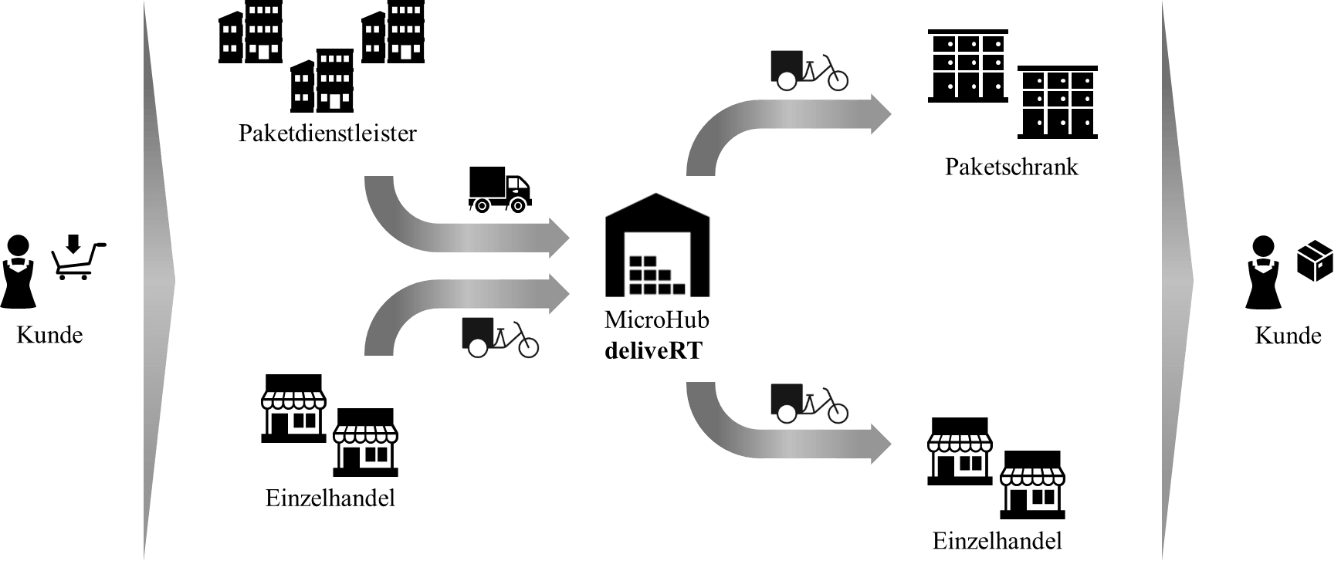 Im Mittelpunkt des Lieferkonzeptes „deliveRT“ steht ein innenstadtnahes Micro-Hub bei der sMail GmbH, in welchem Pakete von unterschiedlichen Paketdienstleistern oder von Einzelhändlern in der Reutlinger Innenstadt gebündelt werden. Von dort aus werden die Pakete im nächsten Schritt konsolidiert in der Innenstadt zugestellt. Der Zustellungsort kann entweder ein Paketschrank, ein Paketshop oder die persönliche Adresse des Kunden sein. Derzeit steht bereits ein Paketschrank am Rathaus Reutlingen. Zwei weitere Paketschränke werden alsbald folgen. Durch die Angabe der Micro-Hub Adresse als Zustellort und einer persönlichen Identifikationsnummer, in der c/o-Adresszeile erfolgt im Micro-Hub einer Zuordnung und Konsolidierung der Pakete. Die Bürger von Reutlingen erhalten ihre Pakete anschließend durch eine emissionsfreie Zustellung mithilfe von elektrifizierten Lastenfahrrädern zu einem frei wählbaren Zeitpunkt an einen Ort ihrer Wahl (beispielsweise einem Paketschrank).