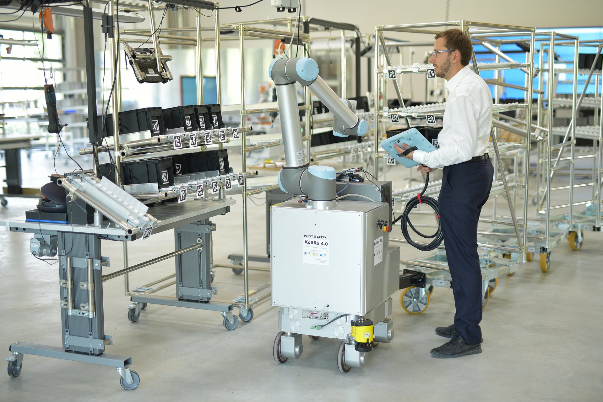 Ziel des Projekts ist die Entwicklung eines kollaborativen Routenzugs zur Automatisierung der Produktionslogistik. Heutzutage werden Materialbereitstellungstätigkeiten in den meisten Fällen noch manuell durchgeführt. Innerhalb dieser Prozesse haben Routenzüge aufgrund ihrer hohen Ladekapazität und des sicheren Betriebs einen hohen Verbreitungsgrad erlangt. Die Bestückung der Züge sowie die Entladung an den Verbauorten werden dabei manuell durchgeführt. Die Automatisierung dieser Prozesse bietet vor dem Hintergrund der demographischen Entwicklung sowie aus ökonomischen und ergonomischen Gründen ein enormes Potenzial. Der hier zu entwickelnde kollaborative Routenzug besteht aus einem autonom agierenden Zugfahrzeug inklusive Manipulator und Greifsystem für Kleinladungsträger. Er wird mit Sensorik ausgestattet sein, um mit einer Auswahl zu handhabender Gegenstände sowie der unstrukturierten Umgebung zurecht zu kommen. Um autonom und sicher zu sein, muss der kollaborative Routenzug als ein intelligentes System konzipiert sein, welches einen hohen Grad an Flexibilität aufweist. Es soll ein System entwickelt werden, das zu einer interaktiven Mensch-Roboter-Kollaboration befähigt ist. Neben integrierten Sicherheits- und Assistenzsystemen sind dafür BV-Algorithmen für unkontrollierte Umgebungen notwendig. Zudem sollen Verfahren des maschinellen Lernens integriert sowie Wahrnehmungsfunktionalitäten für Lokalisierung und Navigation entwickelt werden.