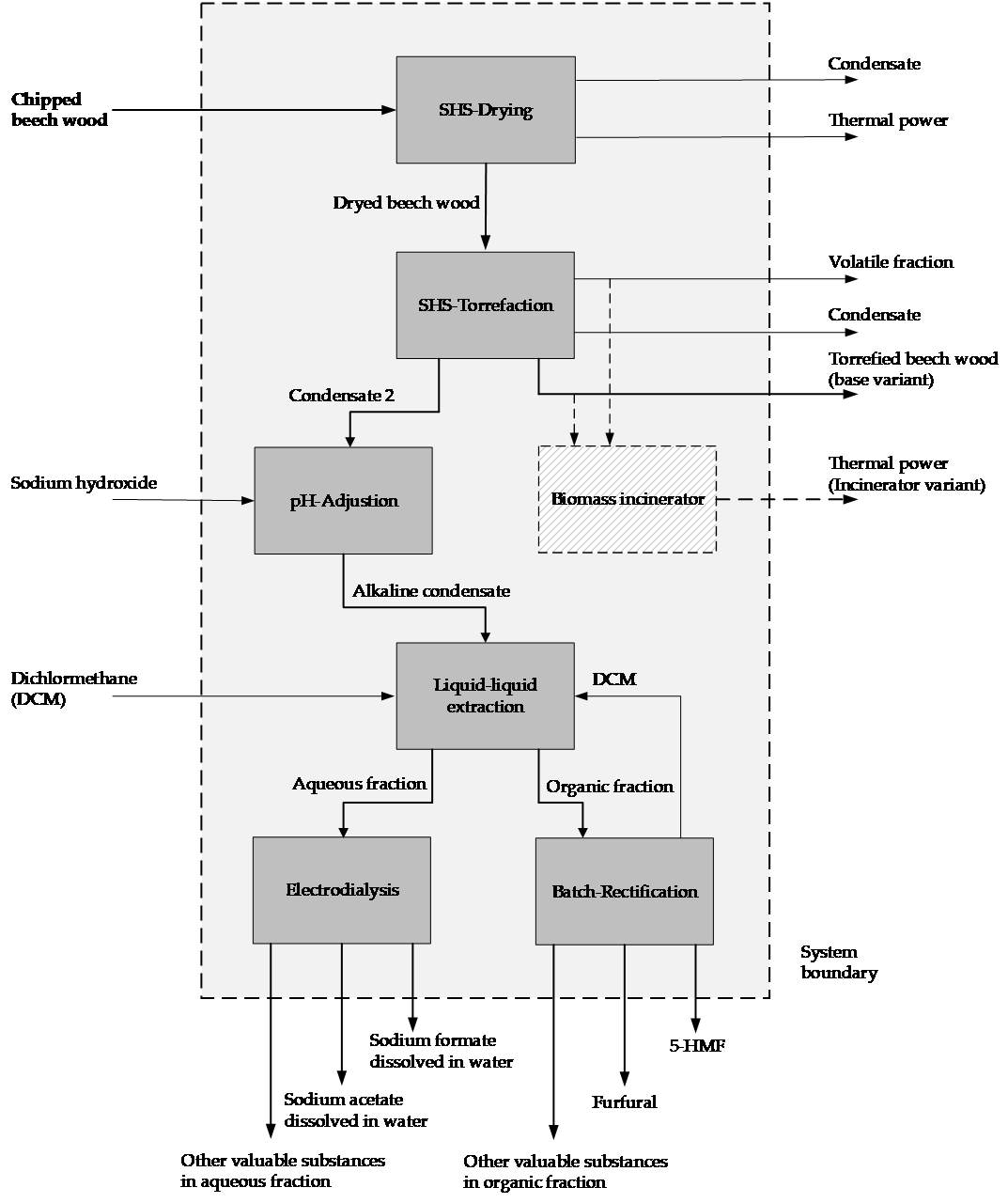 Als Nebenprodukt der SHS-Torrefizierung entsteht ein Kondensat aus Wasser und potenziellen Wertstoffen wie organischen Säuren, Methanol oder Furfural. In dem vom Bundesministerium für Bildung und Forschung (BMBF) geförderten Projekt VALORKON wurden Trennprozesse entwickelt, mit denen diese Plattformchemikalien in hoher Reinheit aus dem Kondensat der Torrefizierung von Buchenholz-Hackschnitzeln gewonnen werden können.