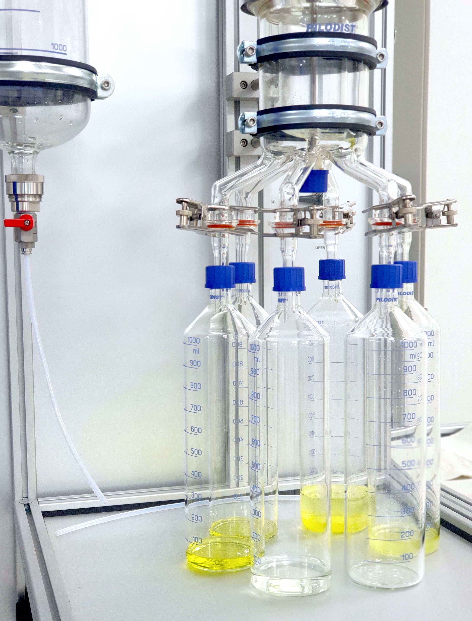 Für die Trennung der Kondensatströme in einzelne Wertstofffraktionen wurde eine Batch-Rektifikationsanlage in Betrieb genommen. In Kombination mit weiteren Trennverfahren, wie Extraktion und Elektrodialyse, konnte Furfural mit einer Reinheit von ca. 95 Prozent aus dem Kondensat gewonnen werden. Die Aufreinigung weiterer Wertstofffraktionen, beispielsweise organischer Säuren, ist Teil der noch laufenden Arbeiten.